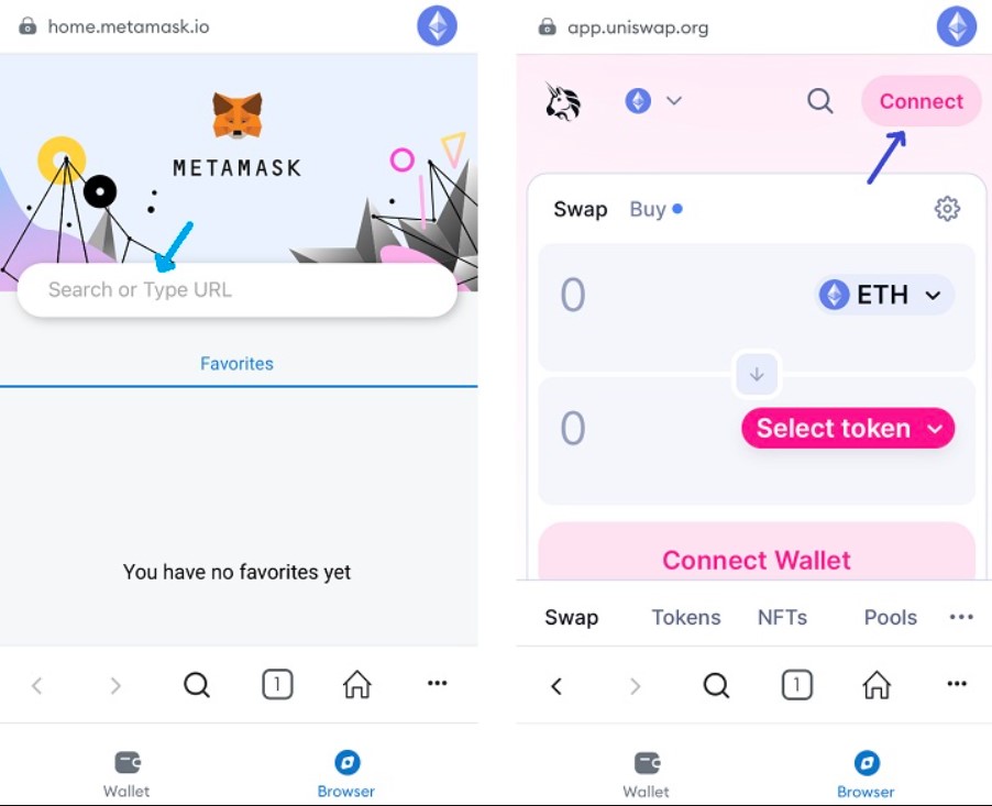 Head over to the Uniswap website’s page – app.uniswap.org. Then click “Connect Wallet”. Choose MetaMask from the dropdown menu. You will be asked to confirm the connection from your MetaMask extension. After connecting, make sure “ETH” is chosen as your major token for trading.