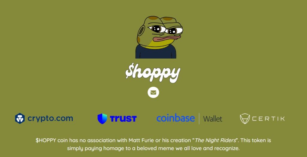 HOPPY a.k.a. Hoppy Coin jumped into the crypto world with a thousand memes’ worth of energy. This is not another memecoin – it is a mass culture reference to a favorite green frog character from Matt Furie’s comic book “The Night Riders”. Hoppy the Frog gave birth to the unique meme coin that is based on the Ethereum blockchain.