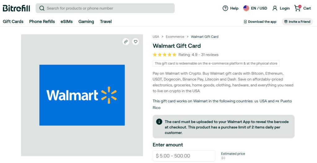 Walmart also supports cryptocurrency gift cards since the end of 2024. It means that Walmart customers can buy Walmart gift cards through cryptocurrency transactions without additional fees. The supported crypto assets are Bitcoin and Ethereum through the platform Bitrefill. Such gift cards give an additional method to shop at Walmart through the Walmart application. You should check the latest Bitrefill’s offer for Walmart users who want to buy gift cards with crypto.