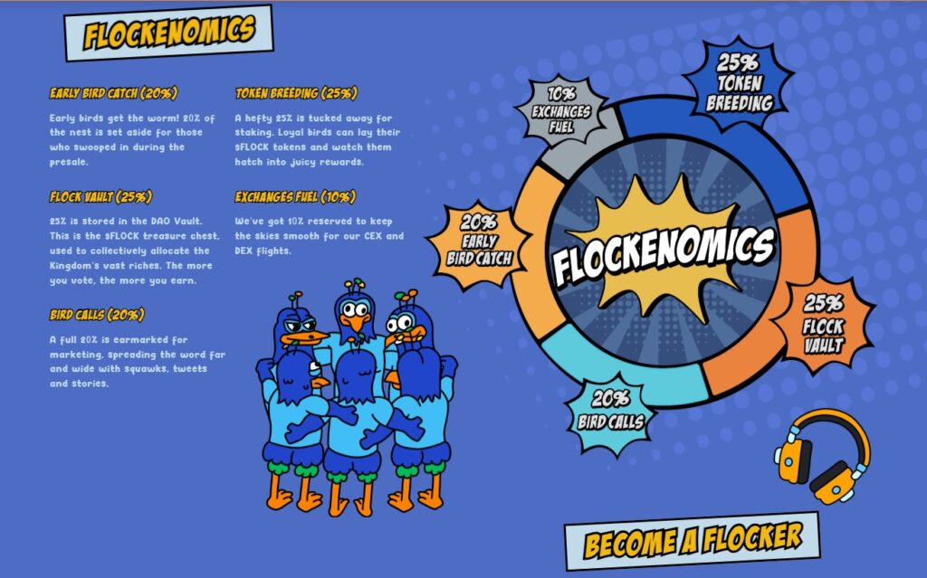 • Flockerz developed an attractive brand identity that emphasizes playful elements. The creative storyline revolves around the “Blue Bird Kingdom” which features a “bird king” leader along various bird subjects. The project relies on its captivating lore for memes together with shareable artwork with the same viral potential as Dogecoin and Shiba Inu did;